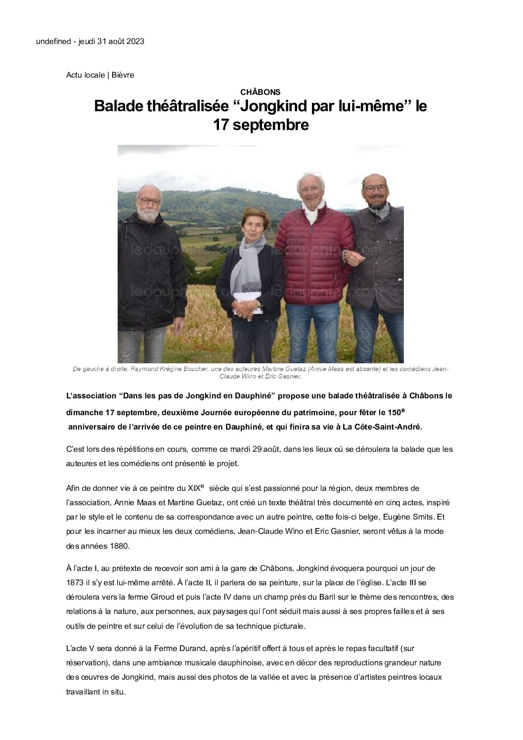La balade théâtralisée débutera vers 10h 30 à la gare, après l’inauguration du parvis Jongkind par le maire, et devrait se terminer vers 13h. Le public sera accompagné tout le long du parcours par les bénévoles de l’association. Pour s’inscrire à la balade gratuite et pour réserver le repas (participation de 16€/personne): https://jongkind.fr